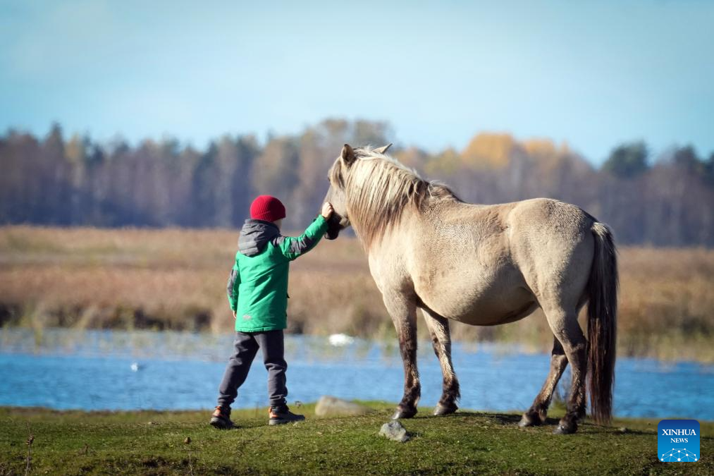 A boy interacts with a horse at a nature park in Engure, at the seashore of the Gulf of Riga, Latvia, Oct. 19, 2025. (Photo by Edijs Palens/Xinhua)