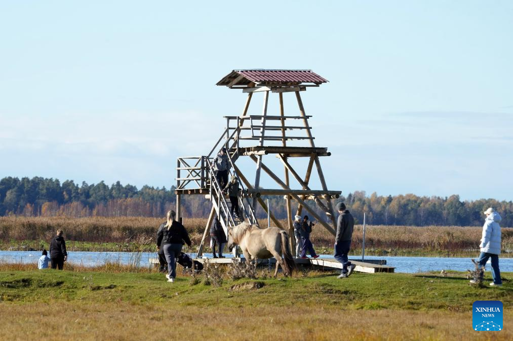 A tourist takes photos of a horse at a nature park in Engure, at the seashore of the Gulf of Riga, Latvia, Oct. 19, 2025. (Photo by Edijs Palens/Xinhua)
