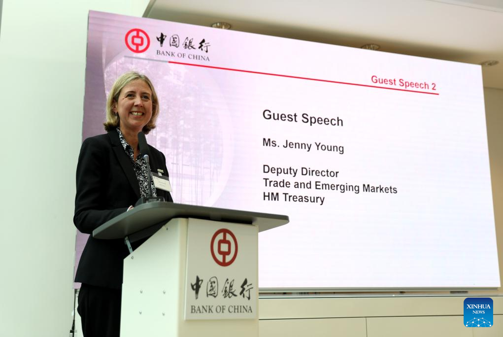 Jenny Young, deputy director of trade and emerging markets at the British Treasury, delivers a sppech during a roadshow hosted by Bank of China in London, Britain, Oct. 20, 2025. Bank of China on Monday hosted a roadshow in London to promote the global use of the renminbi (RMB), as officials, financiers and policymakers from China and Britain explore new ways to deepen cross-border financial cooperation. (Xinhua/Li Ying)