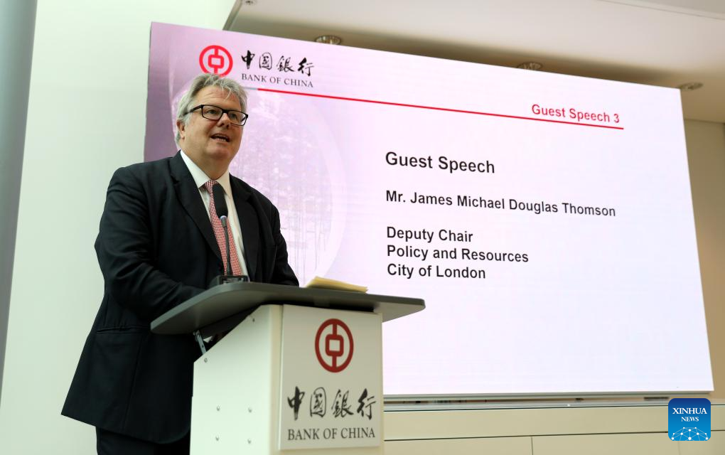 James Michael Douglas Thomson, deputy chair of policy and resources at the City of London Corporation, delivers a sppech during a roadshow hosted by Bank of China in London, Britain, Oct. 20, 2025. Bank of China on Monday hosted a roadshow in London to promote the global use of the renminbi (RMB), as officials, financiers and policymakers from China and Britain explore new ways to deepen cross-border financial cooperation. (Xinhua/Li Ying)