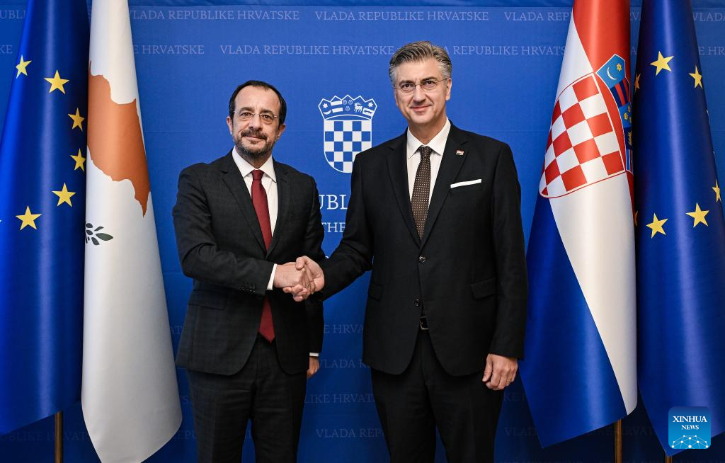 Croatian Prime Minister Andrej Plenkovic (R) meets with visiting Cypriot President Nikos Christodoulides in Zagreb, Croatia, Oct. 21, 2025. (Josip Regovic/PIXSELL via Xinhua)