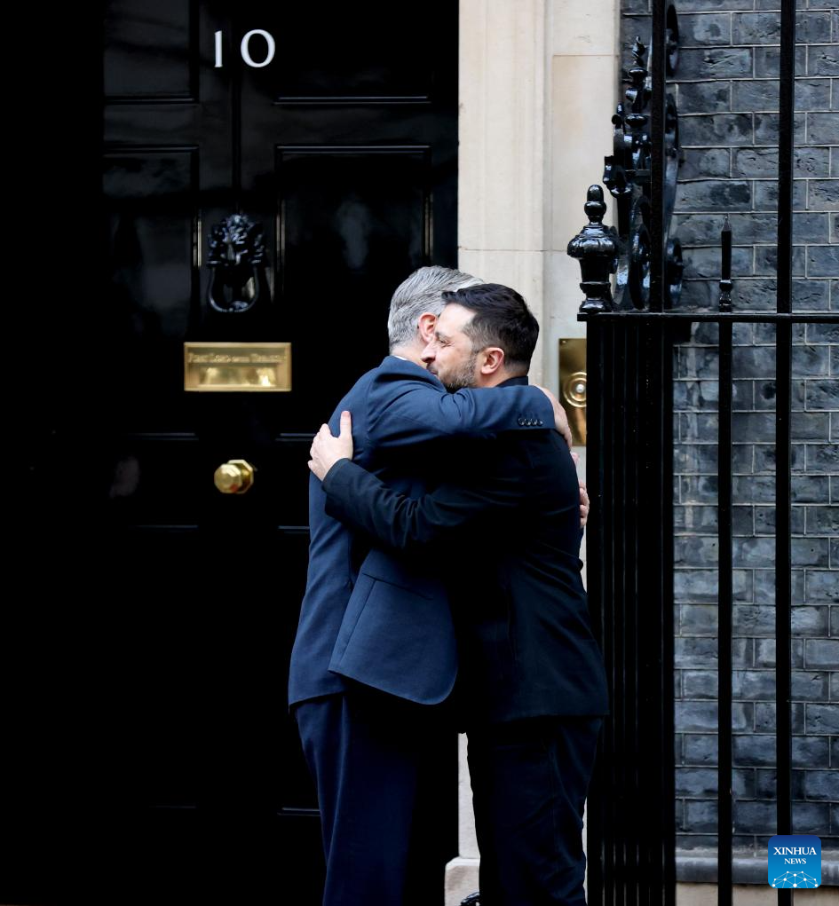 British Prime Minister Keir Starmer (L) welcomes visitting Ukrainian President Volodymyr Zelensky at 10 Downing Street in London, Britain, Oct. 24, 2025. (Xinhua/Li Ying)
