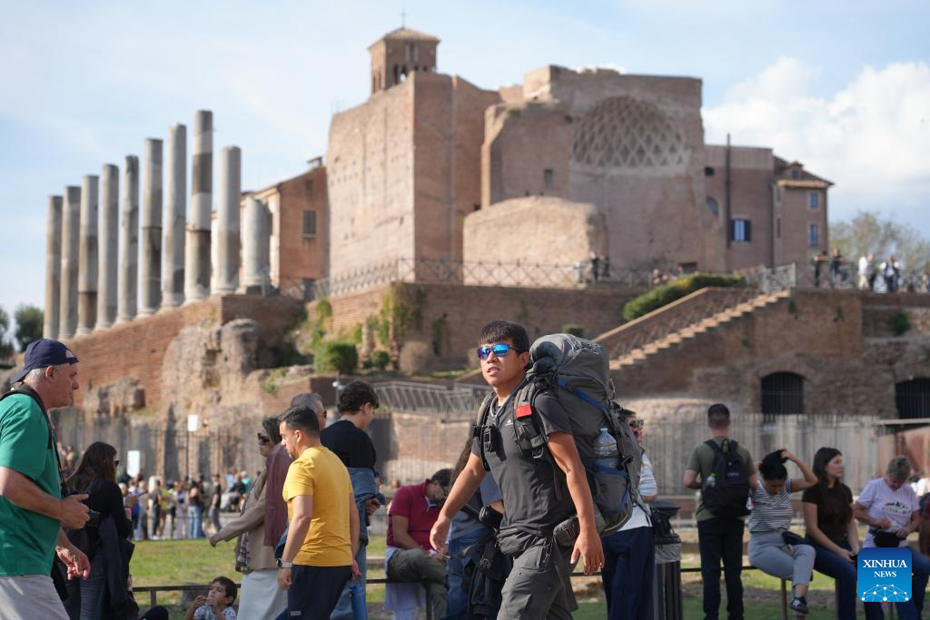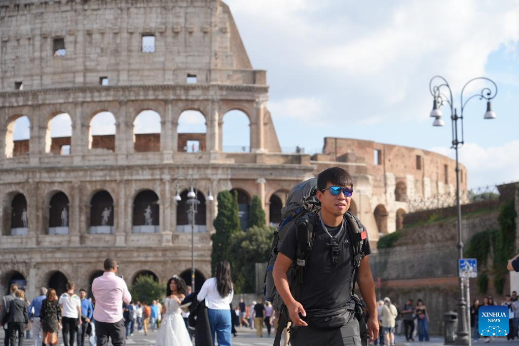 ROME, Oct. 24 (Xinhua) -- Under the autumn sun, 34-year-old Cheng Long stood before the Colosseum in Rome, Italy, a battered rucksack at his feet. In a plain blue T-shirt, skin browned, and hair tousled by wind, he looked every bit the itinerant traveler -- and the endpoint of a two-year walk that began in China's Xi'an and traced the modern echoes of the ancient Silk Road across Eurasia.