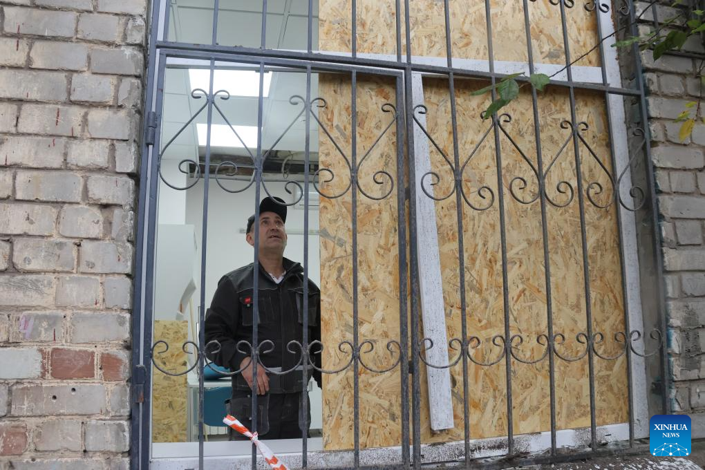 A man reinforces a window damaged in an airstrike in Kiev, Ukraine, on Oct. 25, 2025. One person was killed and 10 others were injured in Russian strikes on the Ukrainian capital overnight from Friday to Saturday, said a local official. (Photo by Peter Druk/Xinhua)