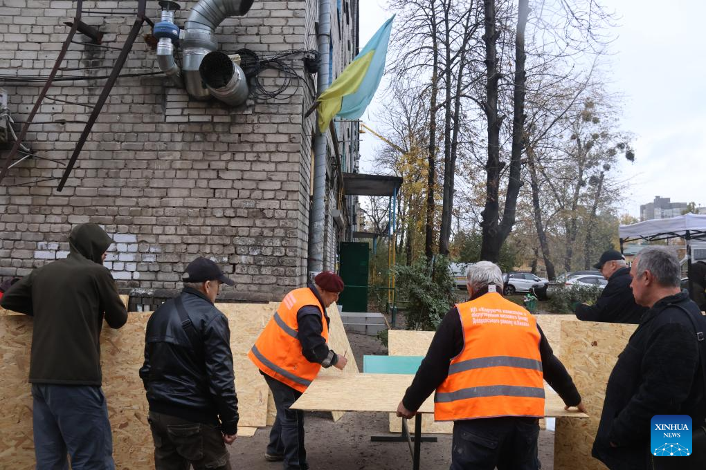 People reinforce a door damaged in an airstrike in Kiev, Ukraine, on Oct. 25, 2025. One person was killed and 10 others were injured in Russian strikes on the Ukrainian capital overnight from Friday to Saturday, said a local official. (Photo by Peter Druk/Xinhua)