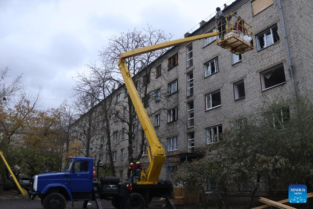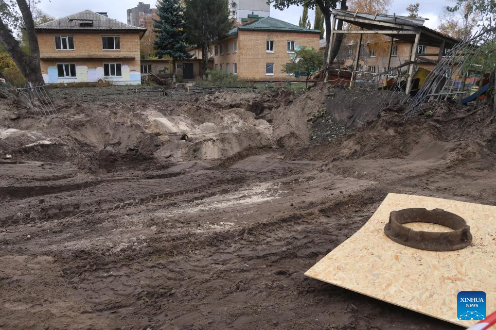 This photo taken on Oct. 25, 2025 shows the site of an airstrike in Kiev, Ukraine. One person was killed and 10 others were injured in Russian strikes on the Ukrainian capital overnight from Friday to Saturday, said a local official. (Photo by Peter Druk/Xinhua)