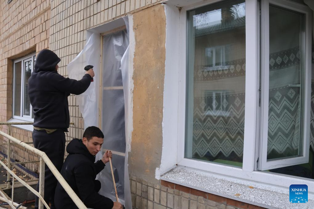 People reinforce the windows of a residential building damaged in an airstrike in Kiev, Ukraine, on Oct. 25, 2025. One person was killed and 10 others were injured in Russian strikes on the Ukrainian capital overnight from Friday to Saturday, said a local official. (Photo by Peter Druk/Xinhua)