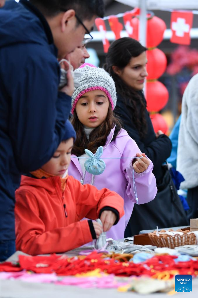 Children learn to make sachets during the "Meet China" cultural festival at Waisenhaus Square in Bern, the capital of Switzerland, Oct. 25, 2025.