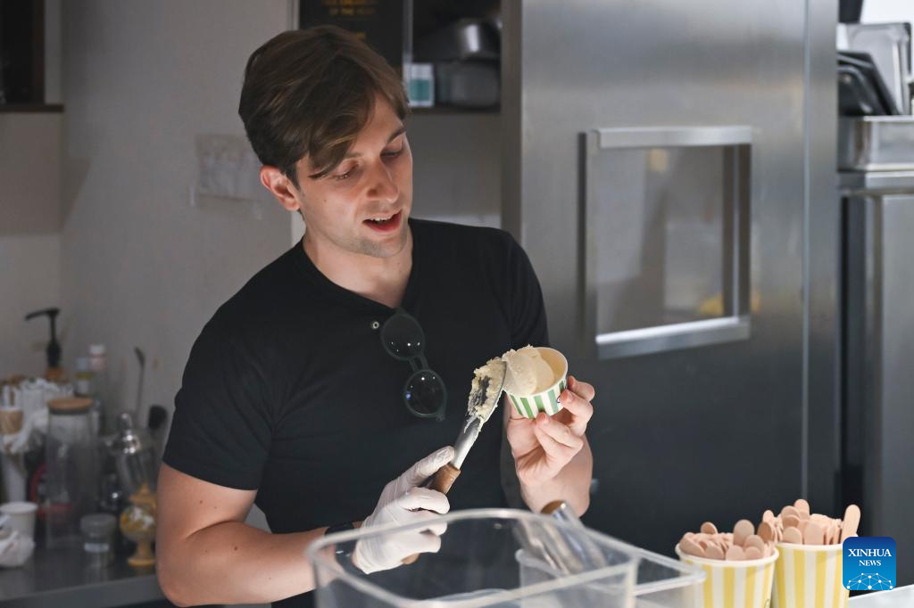 Alessandro Conti makes Italian-style ice cream at his gelato shop in Shanghai, east China, Sept. 30, 2025. (Xinhua/Chen Haoming)