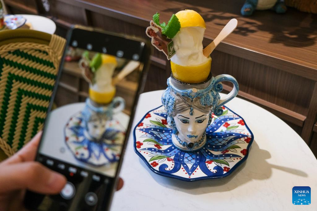 A customer takes photos of an Italian-style ice cream at the gelato shop Amuni Gelato in Shanghai, east China, Oct. 12, 2025. (Xinhua/Zhou Xinyi)