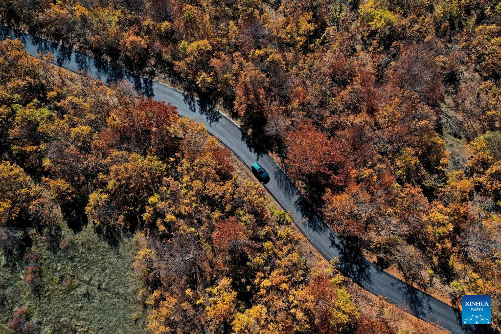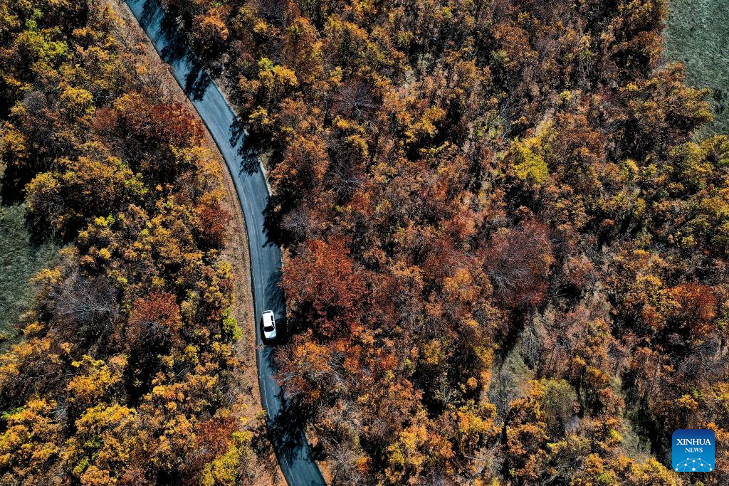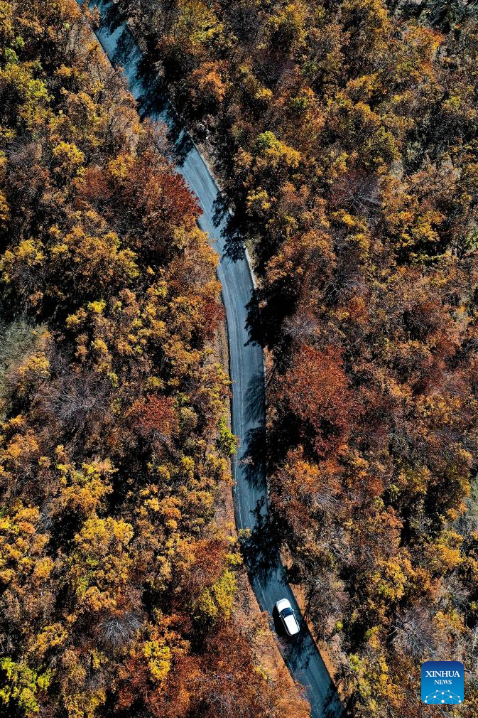 An aerial drone photo shows a car running on a road at Skopska Crna Gora, some 35 km from the capital of Skopje in North Macedonia, on Nov. 2, 2025. (Photo by Tomislav Georgiev/Xinhua)