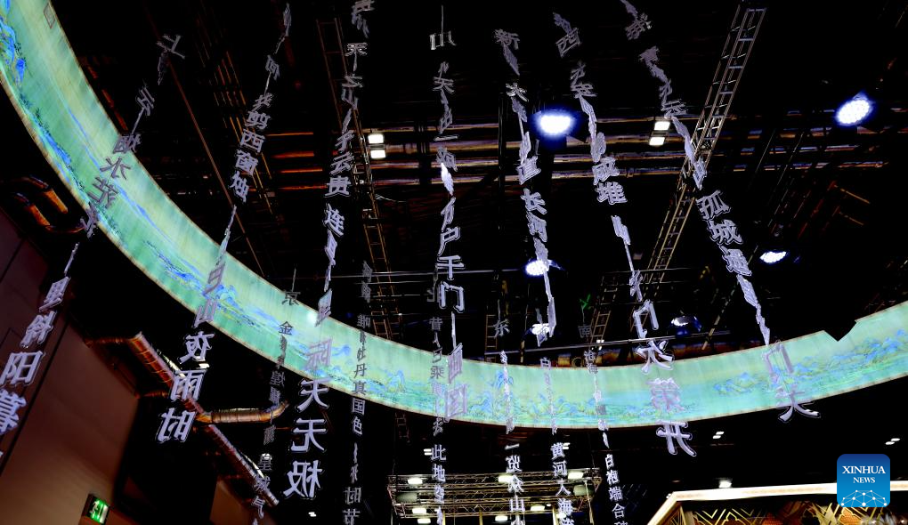 This photo taken on Nov. 4, 2025 shows a view of "Chinese poems" at the China pavilion of the World Travel Market (WTM) London 2025 in London, Britain. The WTM London 2025 opened on Tuesday, with the China pavilion drawing attention for its abundant tourism resources and cultural appeal. (Xinhua/Li Ying)