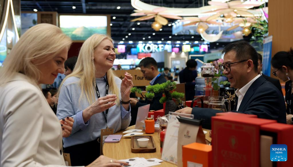 People taste Chinese tea at the China pavilion of the World Travel Market (WTM) London 2025 in London, Britain, Nov. 4, 2025. The WTM London 2025 opened on Tuesday, with the China pavilion drawing attention for its abundant tourism resources and cultural appeal. (Xinhua/Li Ying)