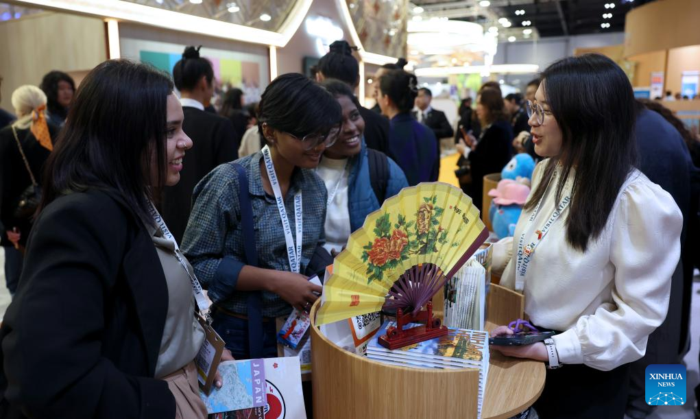 People visit the China pavilion of the World Travel Market (WTM) London 2025 in London, Britain, Nov. 4, 2025. The WTM London 2025 opened on Tuesday, with the China pavilion drawing attention for its abundant tourism resources and cultural appeal. (Xinhua/Li Ying)
