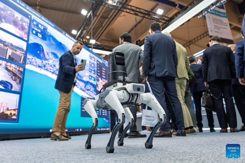 A robotic dog is seen at the 2025 Smart City Expo World Congress in Barcelona, Spain, Nov. 4, 2025. The event will last till Nov. 6. (Photo by Joan Gosa/Xinhua)