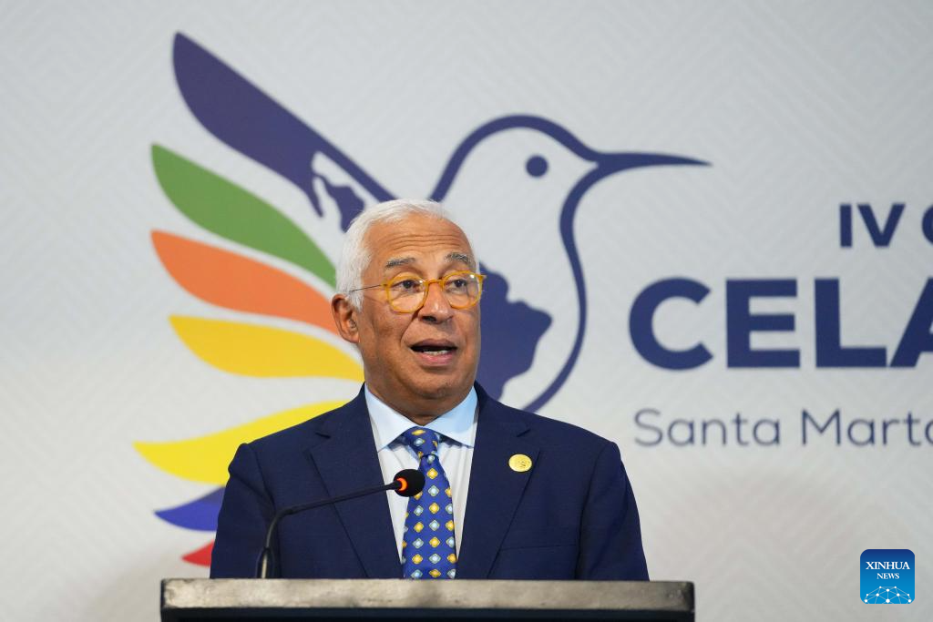 European Council President Antonio Costa attends a joint declaration press conference during the fourth summit between the Community of Latin American and Caribbean States (CELAC) and the European Union (EU) in Santa Marta, Colombia, Nov. 9, 2025. The fourth CELAC-EU summit opened Sunday in Santa Marta, Colombia, where the two sides issued a joint declaration on energy, environment and energy transitions. (Photo by Andres Moreno/Xinhua)