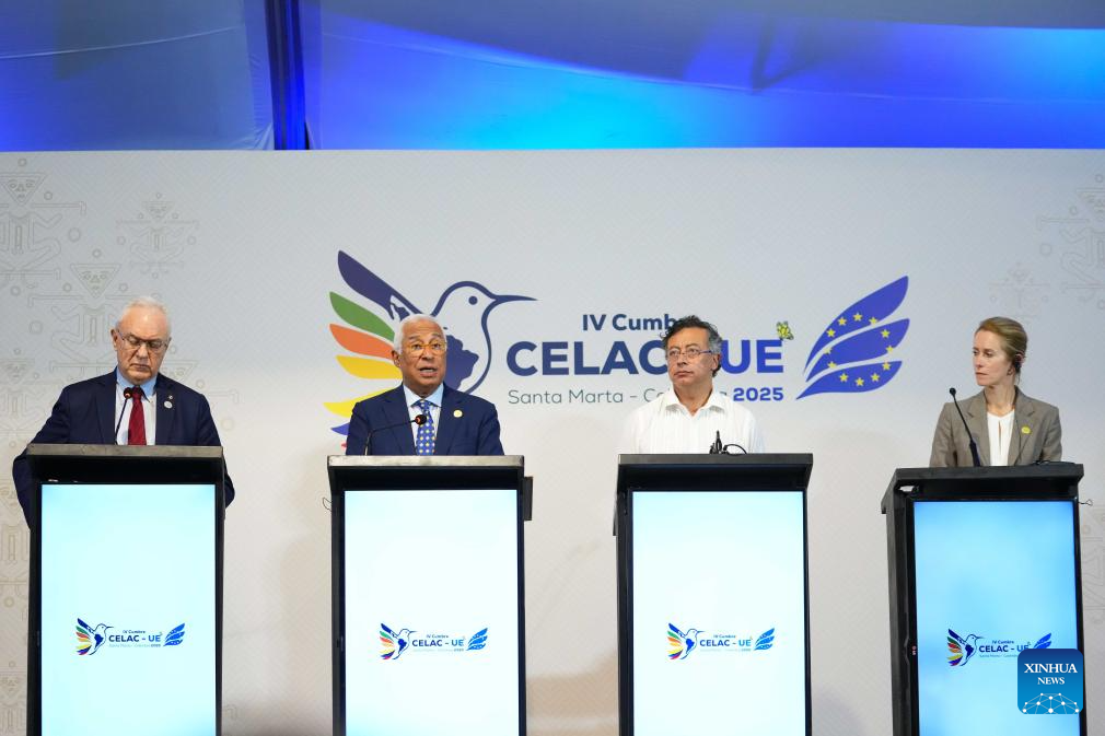 Colombian President Gustavo Petro (2nd R), European Council President Antonio Costa (2nd L), Uruguay's Foreign Affairs Minister Mario Lubetkin (1st L), and European Union (EU) High Representative for Foreign Affairs and Security Policy Kaja Kallas attend a joint declaration press conference during the fourth summit between the Community of Latin American and Caribbean States (CELAC) and the European Union (EU) in Santa Marta, Colombia, Nov. 9, 2025. The fourth CELAC-EU summit opened Sunday in Santa Marta, Colombia, where the two sides issued a joint declaration on energy, environment and energy transitions. (Photo by Andres Moreno/Xinhua)