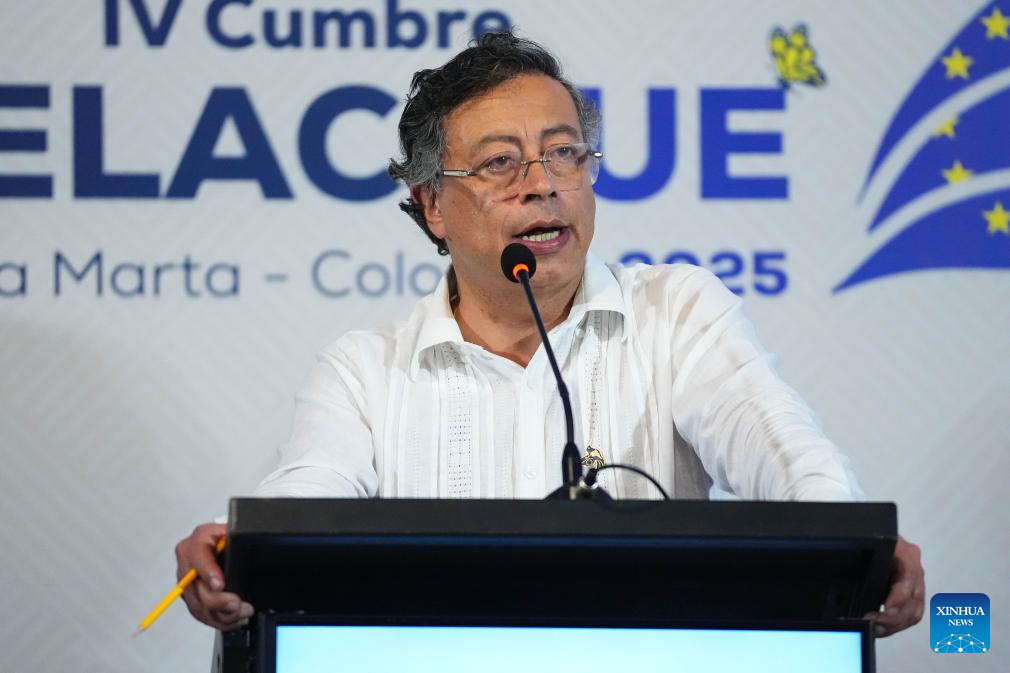 Colombian President Gustavo Petro attends a joint declaration press conference during the fourth summit between the Community of Latin American and Caribbean States (CELAC) and the European Union (EU) in Santa Marta, Colombia, Nov. 9, 2025. The fourth CELAC-EU summit opened Sunday in Santa Marta, Colombia, where the two sides issued a joint declaration on energy, environment and energy transitions. (Photo by Andres Moreno/Xinhua)