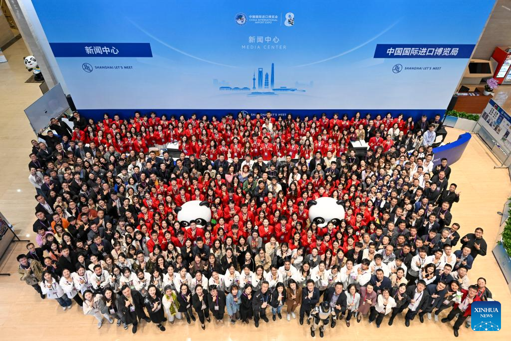 People pose for a group photo at the National Exhibition and Convention Center (Shanghai), the main venue of the eighth China International Import Expo (CIIE) in east China's Shanghai, Nov. 10, 2025. The 8th CIIE concluded here on Monday. (Xinhua/Liu Ying)
