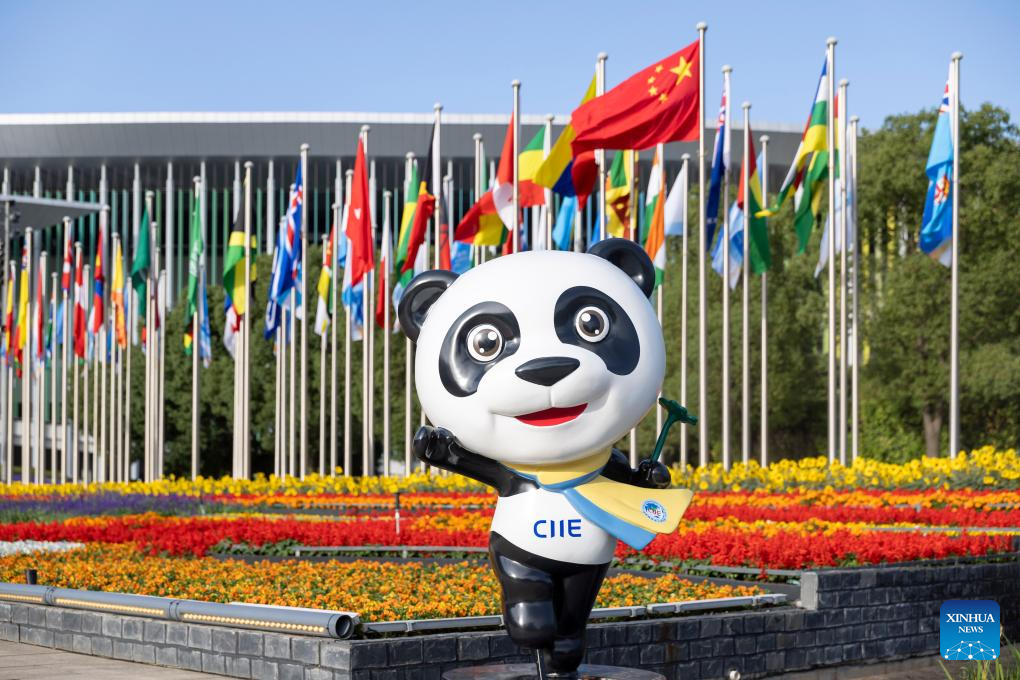 This photo taken on Nov. 10, 2025 shows Jinbao, the mascot of the China International Import Expo (CIIE), at the south square of the National Exhibition and Convention Center (Shanghai), the main venue for the eighth CIIE, in east China's Shanghai. The 8th CIIE concluded here on Monday. (Xinhua/Wang Xiang)