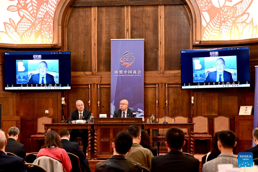Liu Jiandong, chairman of the China Chamber of Commerce to the EU, delivers a speech at the release ceremony of a report in Brussels, Belgium, on Nov. 12, 2025. Confidence among Chinese companies operating in the European Union has fallen to a six-year low amid political headwinds and rising costs, said a report released by the China Chamber of Commerce to the EU and Roland Berger, a consultancy, on Wednesday. Despite the weaker sentiment, the performance of Chinese companies showed resilience. In 2024, 53 percent of surveyed companies reported higher revenues, and 40 percent said profits rose. (Xinhua/Lyu You)