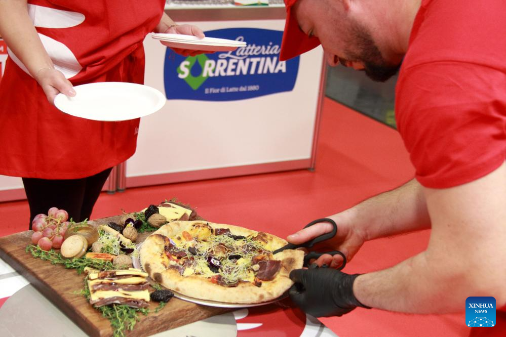 A contestant competes during a pizza competition at the International Food Exhibitions 2025 in Sofia, Bulgaria, Nov. 12, 2025. The four-day event kicked off here at the Inter Expo Center on Wednesday, bringing together five exhibitions dedicated to the food and beverage, meat, dairy, bakery, and wine industries. (Photo by Marian Draganov/Xinhua)