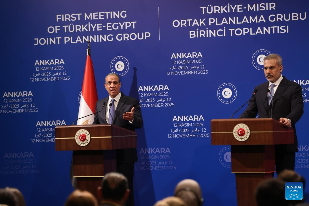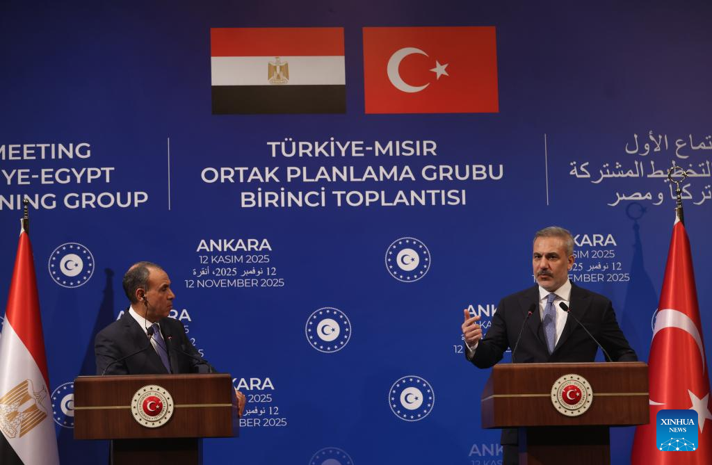 Turkish Foreign Minister Hakan Fidan (R) speaks at a joint press conference with visiting Egyptian Foreign Minister Badr Abdelatty in Ankara, Türkiye, Nov. 12, 2025. (Mustafa Kaya/Handout via Xinhua)