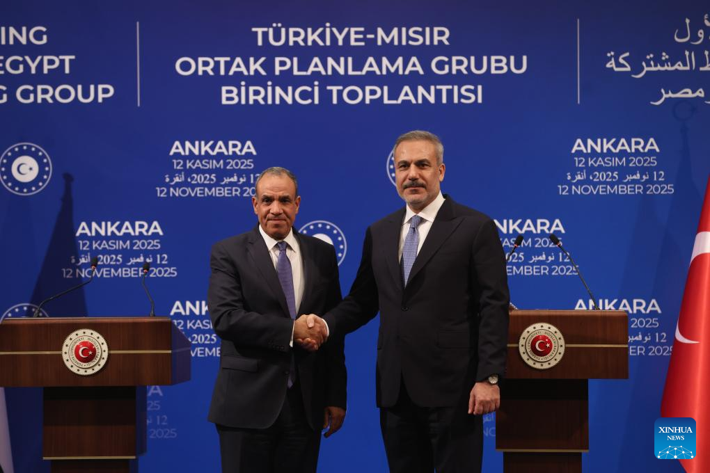 Turkish Foreign Minister Hakan Fidan (R) shakes hands with visiting Egyptian Foreign Minister Badr Abdelatty at a joint press conference in Ankara, Türkiye, Nov. 12, 2025. (Mustafa Kaya/Handout via Xinhua)