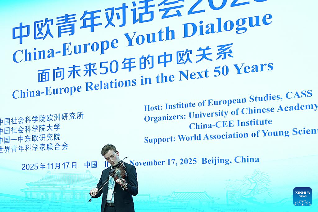 A European representative plays the violin during the China-Europe Youth Dialogue 2025 in Beijing, capital of China, Nov. 17, 2025. The China-Europe Youth Dialogue 2025 was held here on Monday. Hosted by the Institute of European Studies of the Chinese Academy of Social Sciences, the conference has brought together 61 Gen-Z representatives from 30 European countries and about 60 students and young scholars from China -- who are exploring the theme of "China-Europe Relations in the Next 50 Years." (Xinhua)