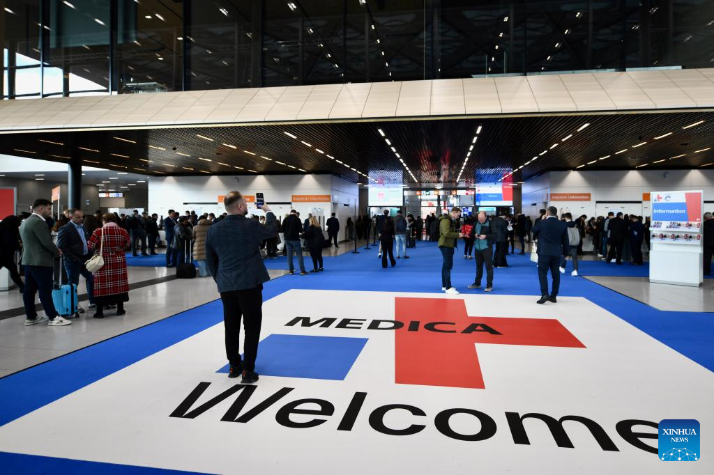 People visit the Medica 2025 in Dusseldorf, Germany, Nov. 17, 2025. A prominent medical device exhibition kicked off on Monday in Dusseldorf, Germany, with more than 1300 Chinese companies attending the event. The Medica 2025 is one of the largest and most influential trade fairs of medical devices. Expecting around 80,000 visitors from over 160 countries and regions, this year's event focused on medical technology and devices, digital health, lab and diagnostics, physio technology, and disposables. Among the participants across the world, the number of Chinese enterprises was the largest from a non-European country. According to the organizer, some 70 countries and regions took part in Medica 2025, which will run through Nov. 20. (Xinhua/Zhang Haofu)