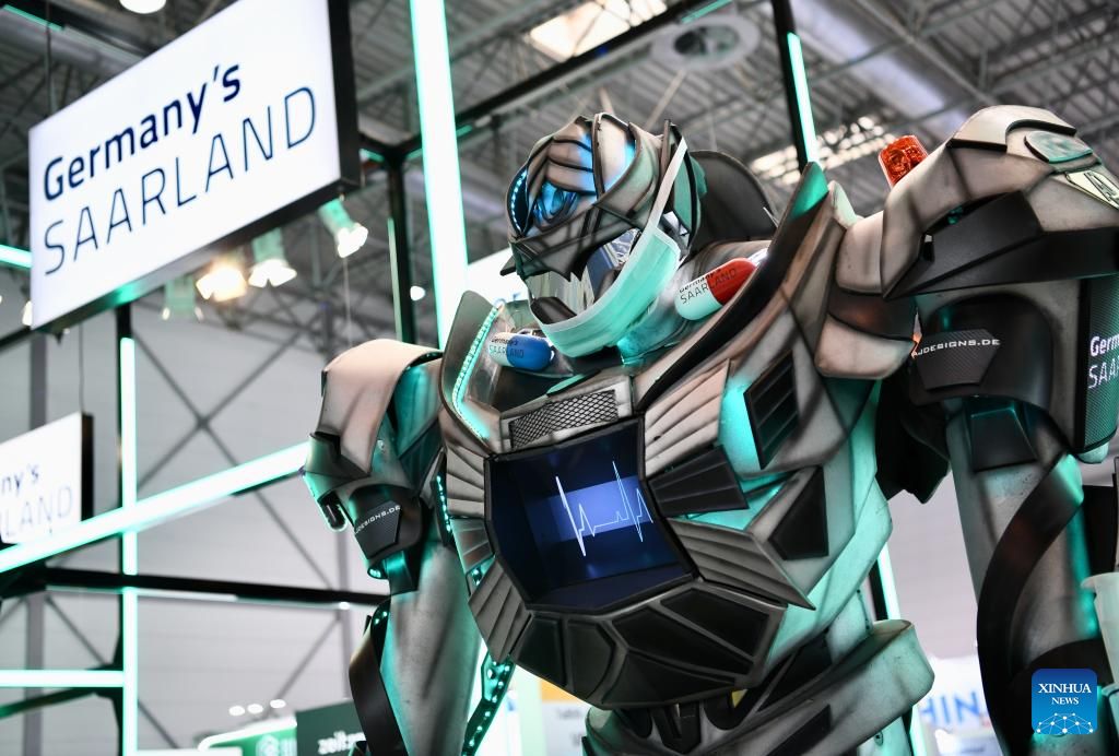 A decorative robot is pictured at the Medica 2025 in Dusseldorf, Germany, Nov. 17, 2025. A prominent medical device exhibition kicked off on Monday in Dusseldorf, Germany, with more than 1300 Chinese companies attending the event.