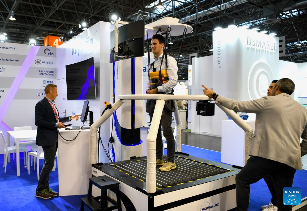 A visitor tries a rehabilitation equipment at the Medica 2025 in Dusseldorf, Germany, Nov. 17, 2025. A prominent medical device exhibition kicked off on Monday in Dusseldorf, Germany, with more than 1300 Chinese companies attending the event.