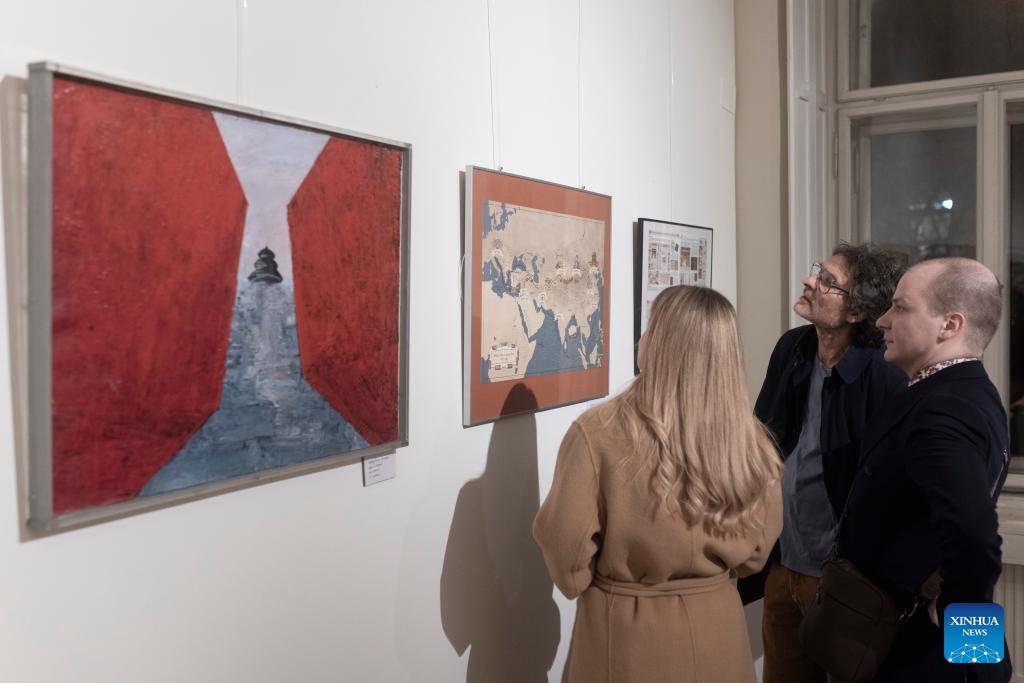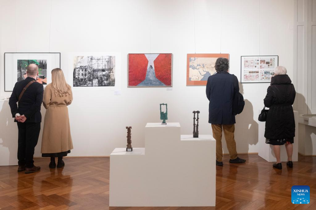 People visit an art exhibition featuring works by Chinese and Slovenian artists in Ljubljana, Slovenia, Nov. 21, 2025. (Photo by Zeljko Stevanic/Xinhua)