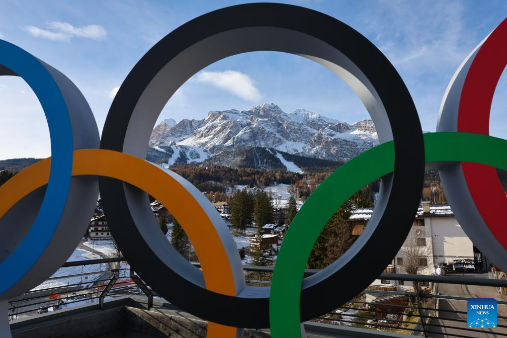 This photo taken on Nov. 22, 2025 shows the emblem of Olympic in Cortina D'Ampezzo, Italy. Located in Italy's northern region of Veneto, Cortina d'Ampezzo is famed for its beauty, ski resort and sporting legacy, beginning with the 1956 Olympic Winter Games and carrying through to Milan-Cortina 2026. (Xinhua/Li Jing)
