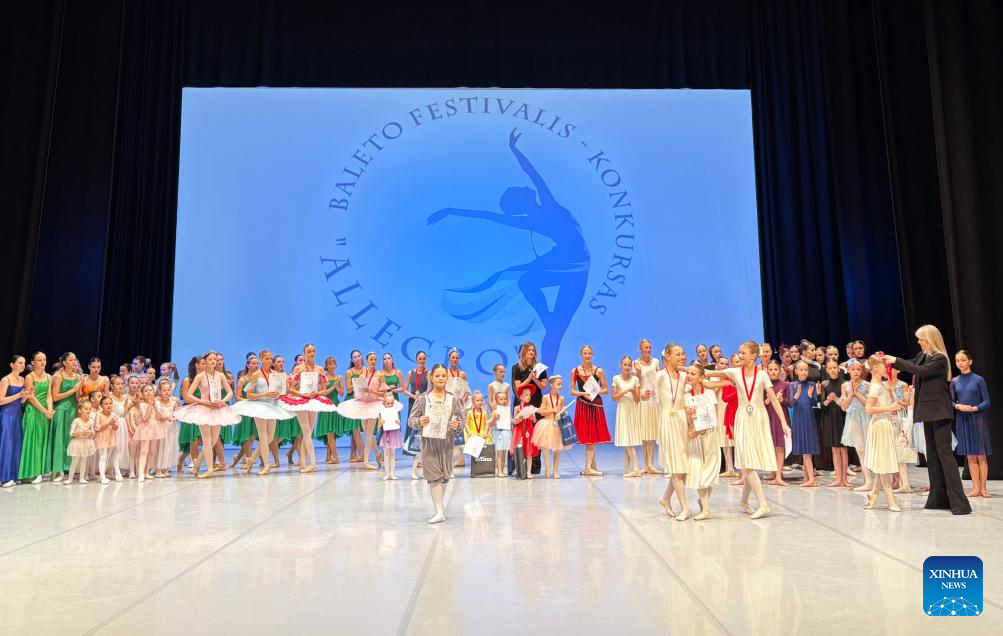 Performers receive awards during the International Ballet and Contemporary Dance Festival-Competition "ALLEGRO 2025" in Vilnius, Lithuania, on Nov. 23, 2025. Hundreds of dancers competed in the event held here from Nov. 22 to 23. (Xinhua/Xue Dongmei)