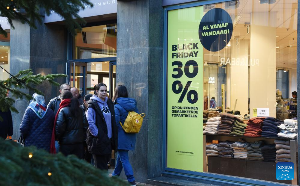 People walks past a shop displaying Black Friday sales signs in the Hague, Netherlands, Nov. 25, 2025. (Xinhua/Shao Haijun)