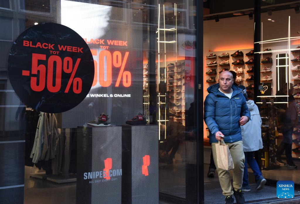 A man walks out a shop displaying Black Friday sales signs in the Hague, Netherlands, Nov. 25, 2025. (Xinhua/Shao Haijun)