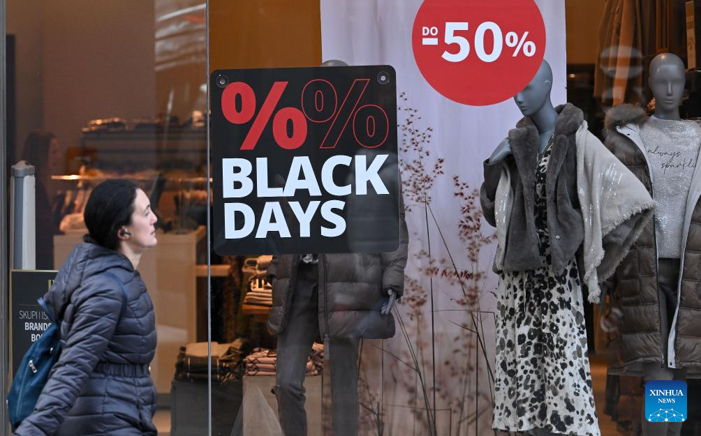 A person passes by the window of a clothes store showing Black Friday discounts in Zagreb, Croatia, Nov. 28, 2025. (Marko Lukunic/PIXSELL via Xinhua)