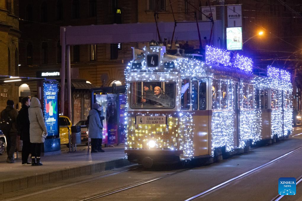 A decorated Christmas tram is seen in Budapest, Hungary on Nov. 28, 2025. (Photo by Attila Volgyi/Xinhua)