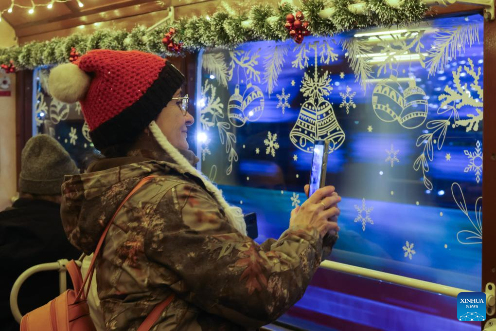 A passenger takes photos on a decorated Christmas tram in Budapest, Hungary on Nov. 28, 2025. (Photo by Attila Volgyi/Xinhua)