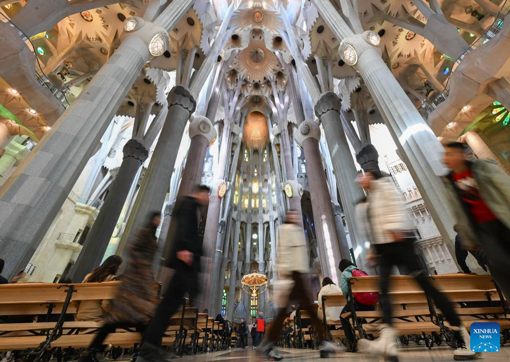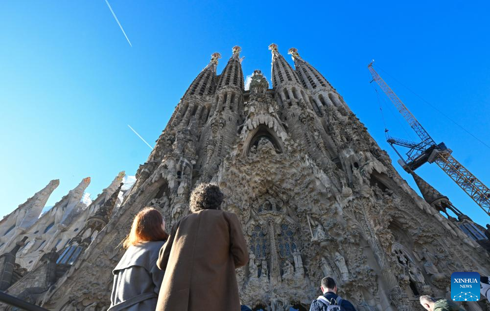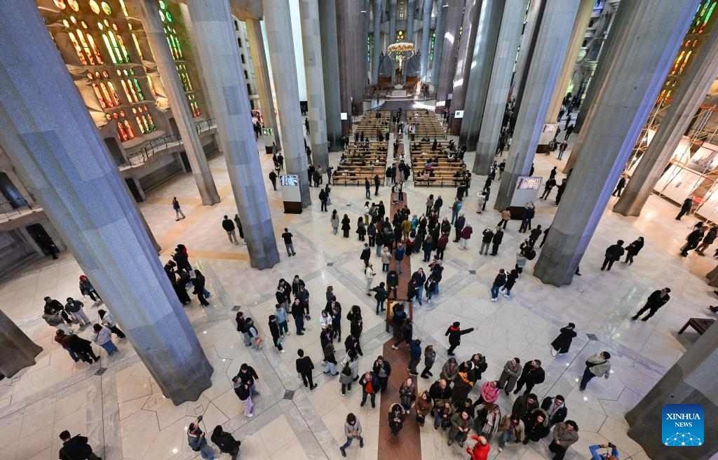 Tourists visit the Sagrada Familia basilica in Barcelona, Spain, on Dec. 1, 2025. Sagrada Familia basilica, a masterpiece of world-renowned designer Antoni Gaudi, is still under construction after the first stone was laid in 1882. (Xinhua/Cheng Min)