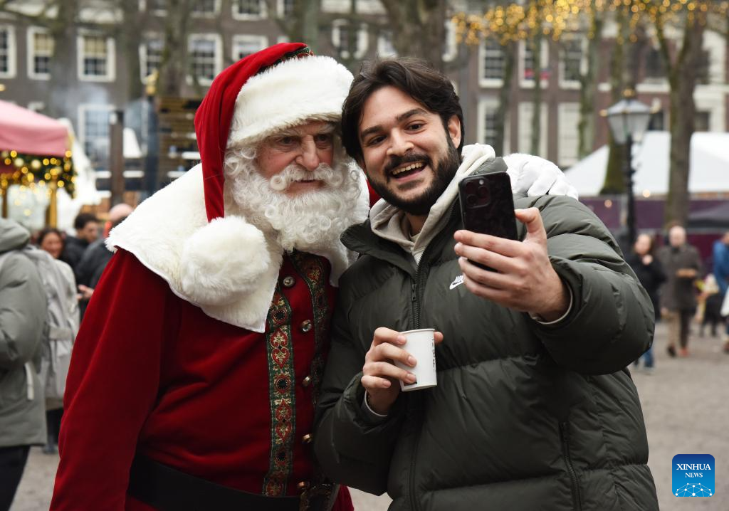 A man takes selfies with an actor dressed as Santa Claus at the Royal Christmas Fair in The Hague, the Netherlands, Dec. 6, 2025. Kicking off here on Dec. 4, the fair will run until Dec. 23. (Xinhua/Shao Haijun)