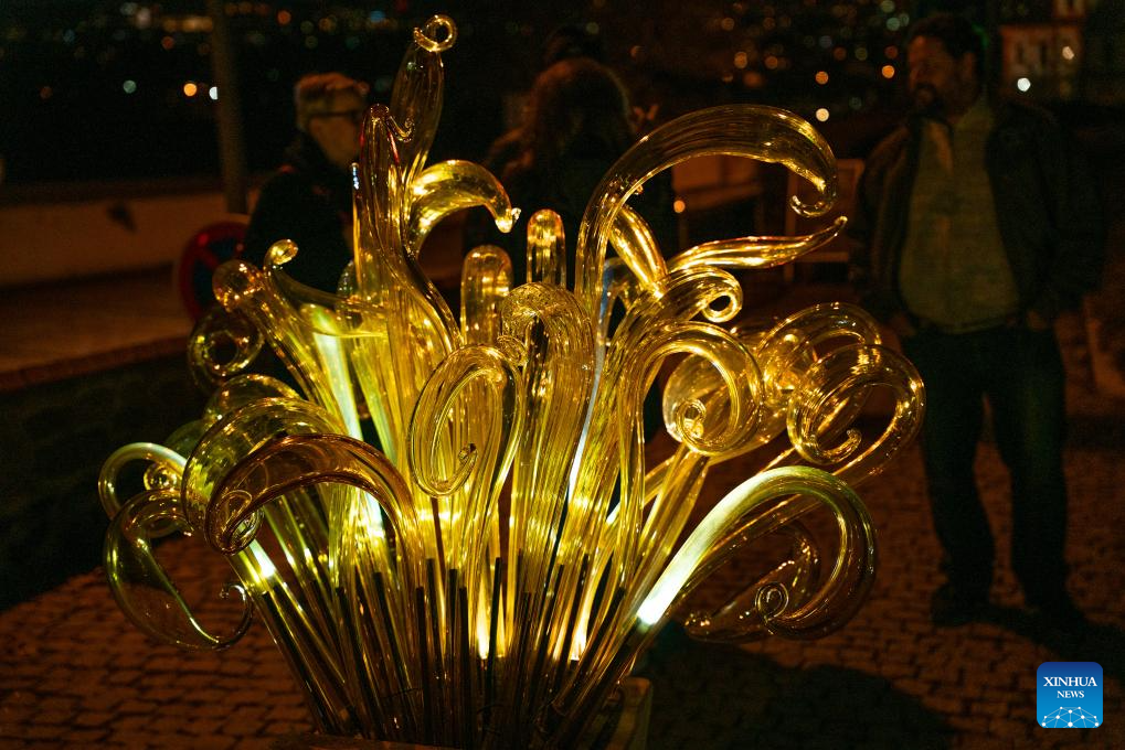 A glass installation is pictured during the exhibition "Crystal Garden: A Glass Symphony" at the Prague Botanical Garden in Prague, the Czech Republic, Dec. 7, 2025.