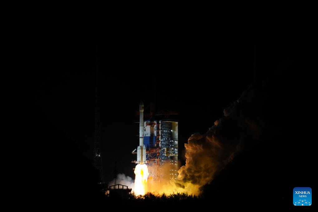 A Long March-3B carrier rocket carrying the Shiyan-22 satellite blasts off from the Xichang Satellite Launch Center in southwest China's Sichuan Province, Dec. 9, 2025. The satellite was launched on Tuesday at 11:08 p.m. (Beijing Time) and entered its planned orbit as scheduled.