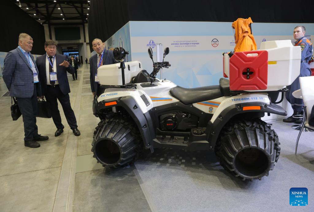 A snowmobile is displayed at an exhibition during the 15th International Forum Arctic: Today and the Future in St. Petersburg, Russia, Dec. 9, 2025. (Photo by Irina Motina/Xinhua)