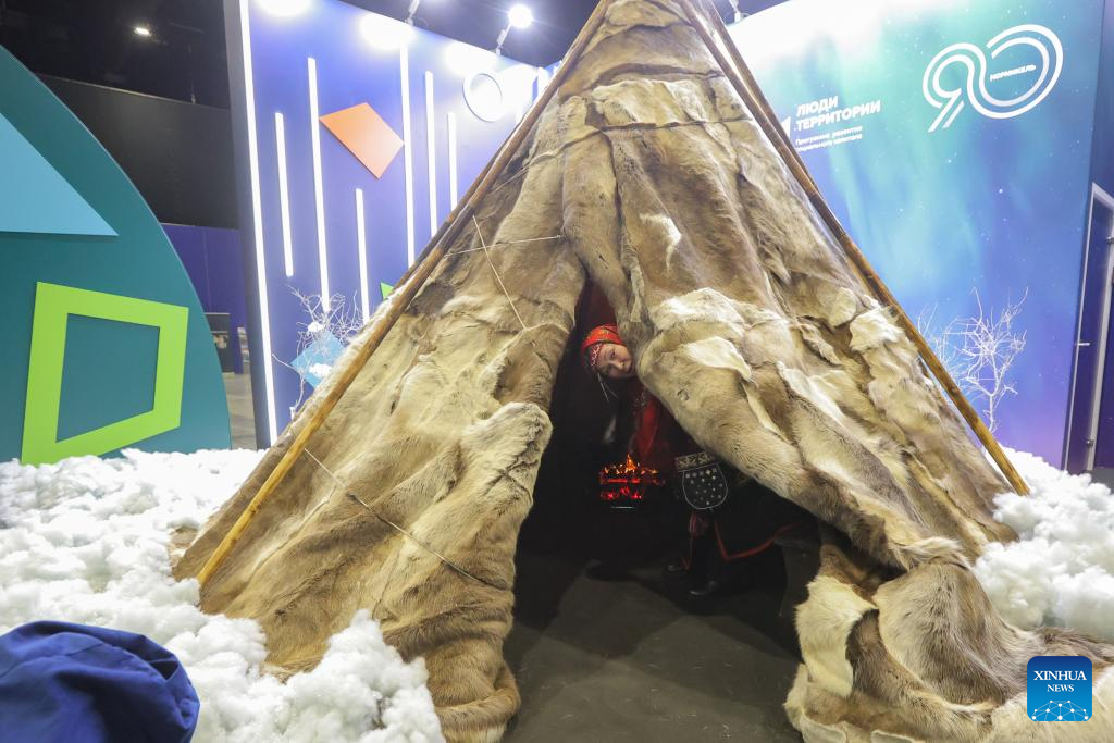 A tent of the indigenous people of Russia's Arctic region is displayed at an exhibition during the 15th International Forum Arctic: Today and the Future in St. Petersburg, Russia, Dec. 9, 2025. (Photo by Irina Motina/Xinhua)