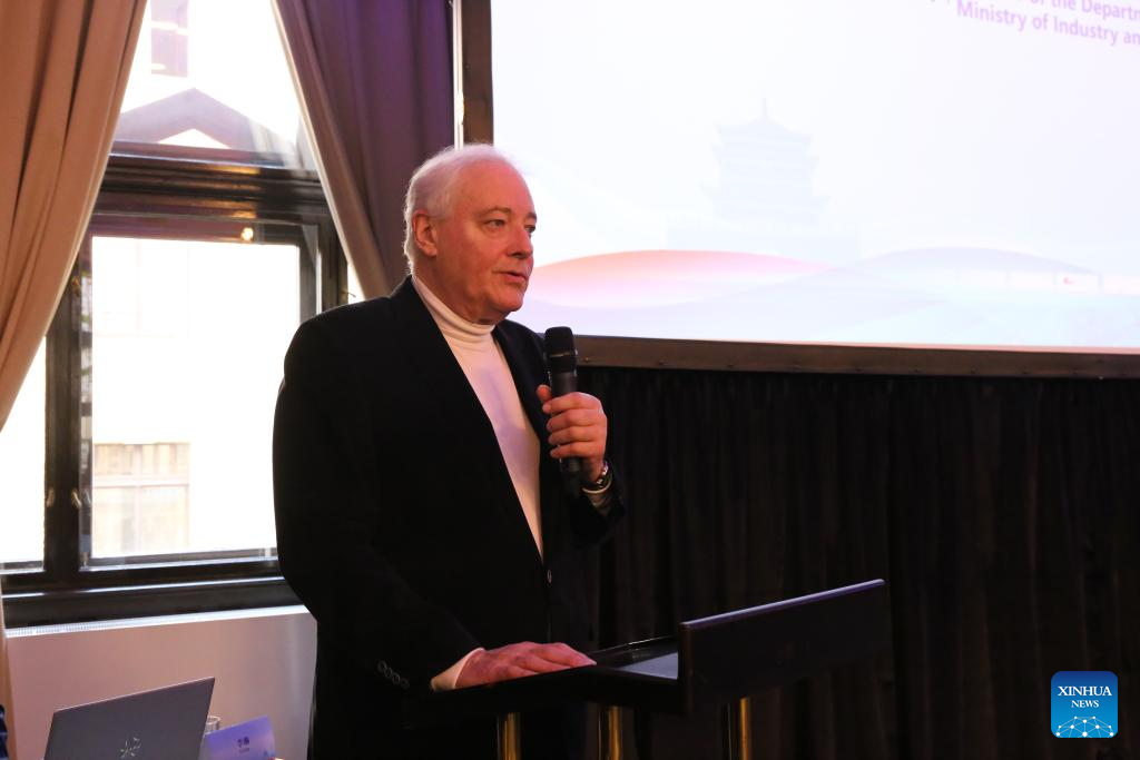 Richard Hlavaty, director of the Department of Non-European Countries at the Czech Republic's Ministry of Industry and Trade, speaks at China (Shaanxi) - Czech Republic Economic and Trade Cooperation Exchange Conference in Prague, the Czech Republic, Dec. 11, 2025. (Photo by Helena Kocova/Xinhua)
