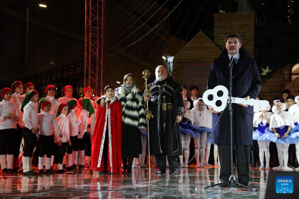 Tbilisi Mayor Kakha Kaladze (1st R) holds a symbolic key to the launch of New Year celebration activities at a lighting ceremony for the main New Year tree of Georgia at the First Republic Square in Tbilisi, Georgia, Dec. 12, 2025. (Tbilisi City Government/Handout via Xinhua)