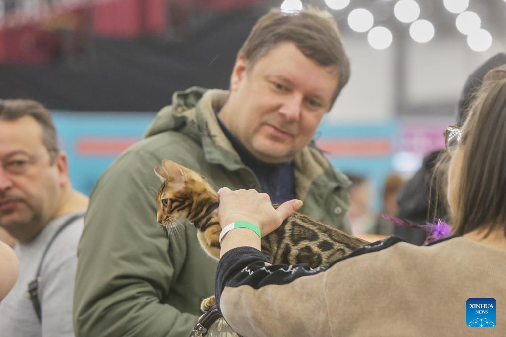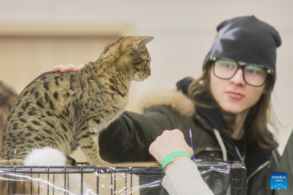 A visitor pets a cat at the 2025 Pet Show in St. Petersburg, Russia, Dec. 14, 2025. The event brings together over 3,000 dogs and 800 cats. (Photo by Irina Motina/Xinhua)