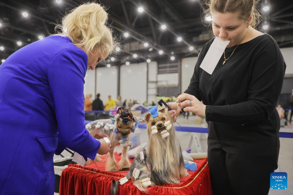 Pet groomers dress up dogs at the 2025 Pet Show in St. Petersburg, Russia, Dec. 14, 2025. The event brings together over 3,000 dogs and 800 cats. (Photo by Irina Motina/Xinhua)